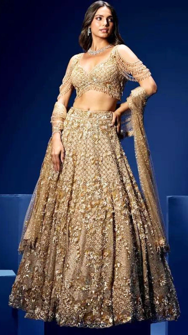 Expertly crafted with intricate embroidery, this Royal Golden Lehenga Choli is the epitome of elegance and luxury. The stunning golden hue adds a touch of royal sophistication, making it perfect for special occasions or formal events. Stand out from the crowd and exude confidence with this timeless piece.