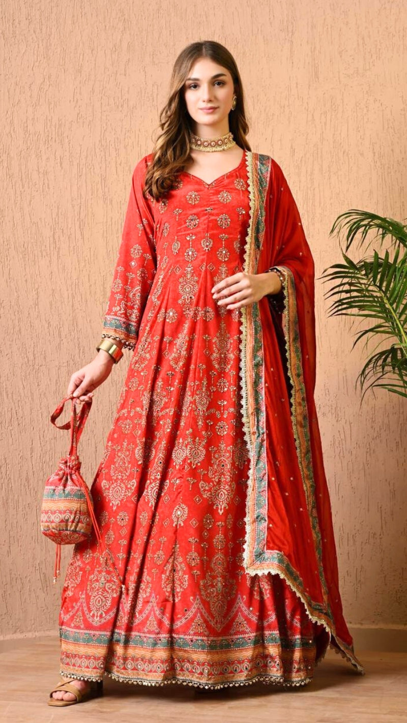 Indulge in the stunning elegance of our Very Pretty Red Anarkali Suit. This beautifully designed ensemble features a classic anarkali silhouette, paired with a delicate dupatta and poli for a complete look. Perfect for any formal occasion, this suit exudes timeless charm and grace.